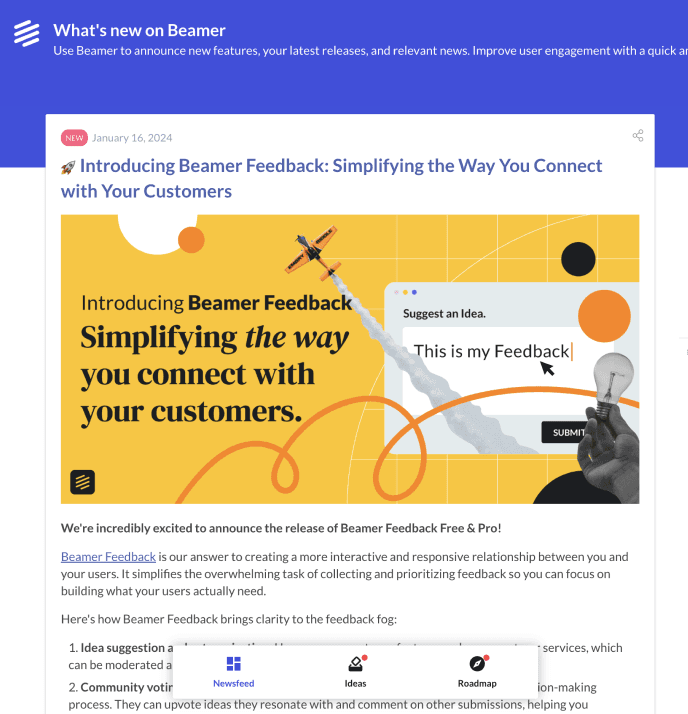 Olvy is a Beamer alternative that helps you collect, analyze and reply to feedback too!